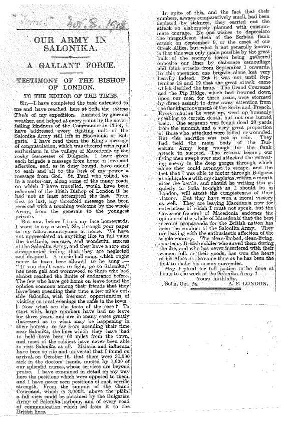 One hundred years ago today, The Times published this impassioned letter from the Bishop of London about the forgotten Salonika Army. You can download a PDF copy of the letter here.