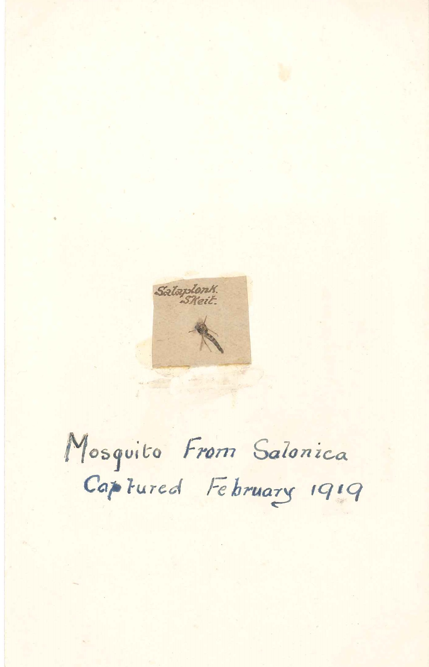 One of the more bizarre items in my Salonika-related post card collection is a dead mosquito, apparently captured in February 1919 and mounted on a post card.