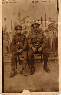 This final photo shows John (right) with a friend from the Remount Service in Constantinople – at least that’s what the less than convincing backdrop says! They don’t look especially impressed.