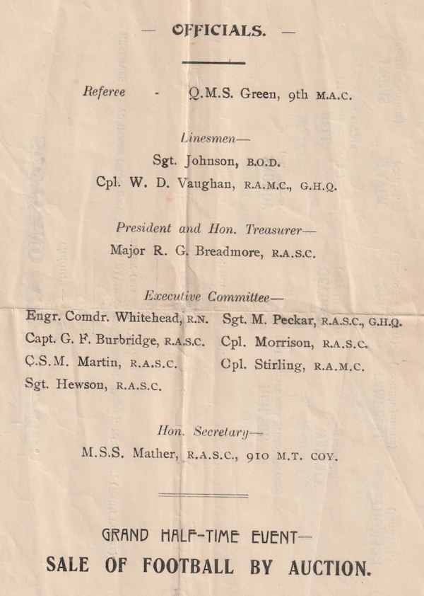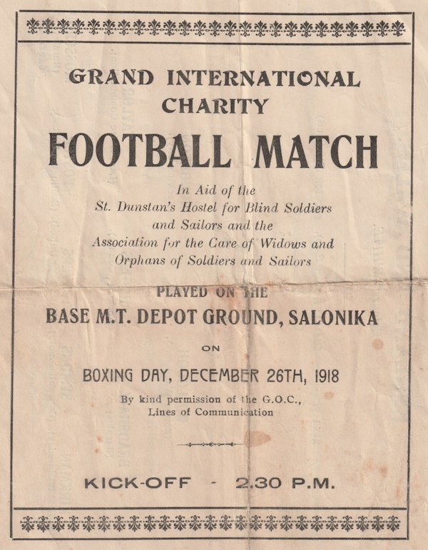 One of the amazing survivals from the collection of Herbert Price (ASC) – which has been donated to the Society – is this football programme from a ‘Grand International Charity Football Match’ played on Boxing Day, 1918.