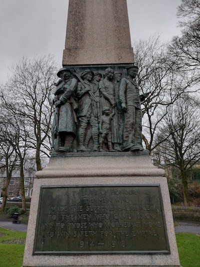 War memorials from the Great War come in all manner of shapes and designs. I recently came across one that struck me as being particularly unusual and moving. Not surprisingly, memorials are usually dedicated to ‘The Glorious Dead’, but this one, in the Lancashire town of Rawtenstall, has a much wider dedication. Entitled Tribute of Honour, it reads as follows: