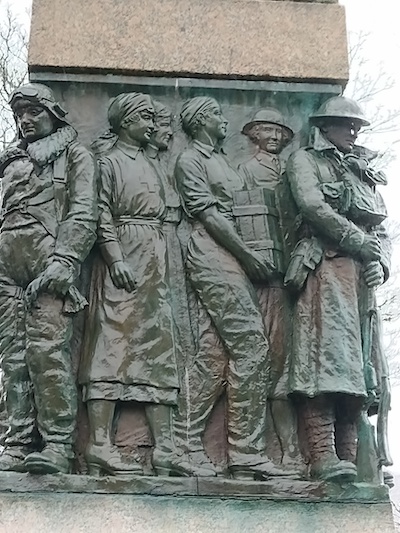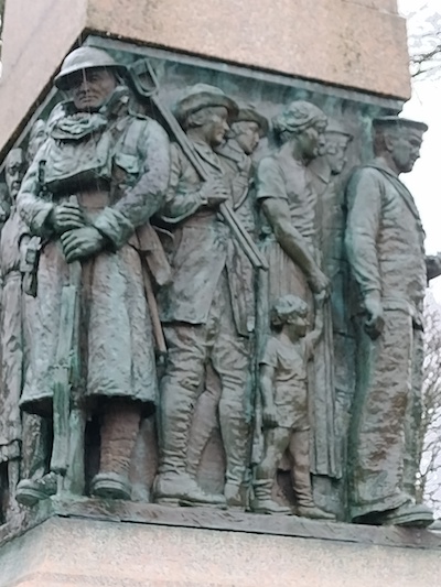 Around the base of the obelisk are four panels with bronze reliefs depicting members of the armed services and, as mentioned in the dedication, ‘those who worked at home’: miners, railwaymen, trawler men, farmers and women in various roles.