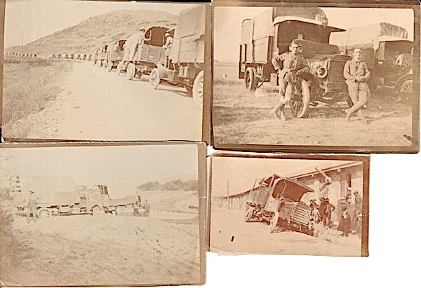 These photos are from the collection of Herbert Price (1895-1960) whose MT company is not known. Helpfully, several of the photos have captions: (top left) Convoy waiting for Bulgar prisoners; (top right) two pals with a lorry; (bottom left) Lorries flying over the perfect Macedonian roads; (bottom right) a lorry stuck in a ditch. Our thanks go to Herbert’s granddaughter, Deborah Elliott, for donating the photos to the Society.