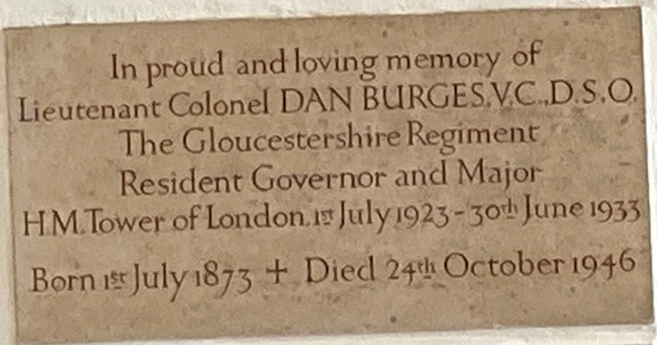 But that wasn’t all! On the other side of the chapel is a plaque to one of the BSF’s two Victoria Cross winners – Lieutenant Colonel Dan Burges – who served at the Tower as Resident Governor and Major during the years between ‘Uncle George’s’ two stints, from 1923 to 1933.