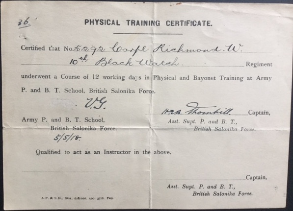 In January 1918 General Headquarters (GHQ) in Salonika felt the need to issue memoranda reminding commanders of formations that they were responsible for the efficiency of their units and for the training of all officers and men in them. In certain technical fields training had to be done at army schools but, generally, the purpose of these schools was to support units by training the trainers who would share, what we would now call ‘best practice’, within them. By this time GHQ Salonika had a number of schools under its control, covering subjects such as infantry training, artillery, signals, the Lewis Gun and anti-gas precautions. A School of Physical and Bayonet Training was also set up, with an Assistant Superintendent authorised by the War Office to coordinate and supervise this training, with a staff of 10 NCOs from the Army Gymnastic Staff (Official History vol. 2, chap. III). Our next sight of William Richmond is as a student at this School.