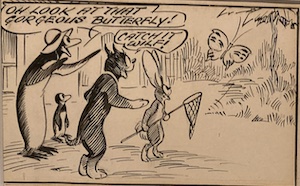 This shows Squeak the penguin, Pip the Dog and Wilfred the rabbit in a comic strip from 1932. They were a long-lived feature in the Daily Mirror, from 1919 to 1953.
