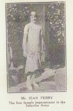 The March 1940 issue of The Mosquito contains the continuation of a fascinating series entitled ‘The Songs We Sang in Salonika’, which gives details of various concert parties and their shows from programmes sent in by readers. Jean Perry was to be found in The Clickety Clicks, the concert party of 66th Infantry Brigade (22nd Division) where he is listed as ‘Miss Jean Perry’, alongside ‘Miss Dorothy Turner’.