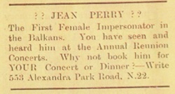 Whatever the case, the trail goes cold after 1931. Jean Perry disappears from the small ads and I am yet to find a response to Mr Canham’s letter in the pages of The Mosquito. So we will probably never know who was the first female impersonator in the Salonika Army!