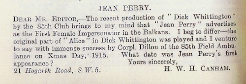 DEAR MR. EDITOR, – The recent production of “Dick Whittington” by the 85th Club brings to mind that “Jean Perry” advertises as the First Female Impersonator in the Balkans. I beg to differ – the original part of “Alice” in Dick Whittington was played and I venture to say with immense success by Corpl. Dillon of 85th Field Ambulance on Xmas Day, 1915. What date was Jean Perry’s first appearance?
