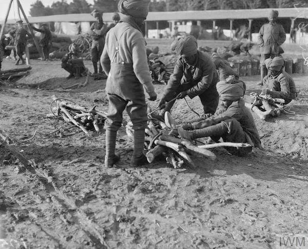Indian troops from the Supply and Transport Corps tying firewood into bundles, Salonika, 1916. © IWM (Q 31673)