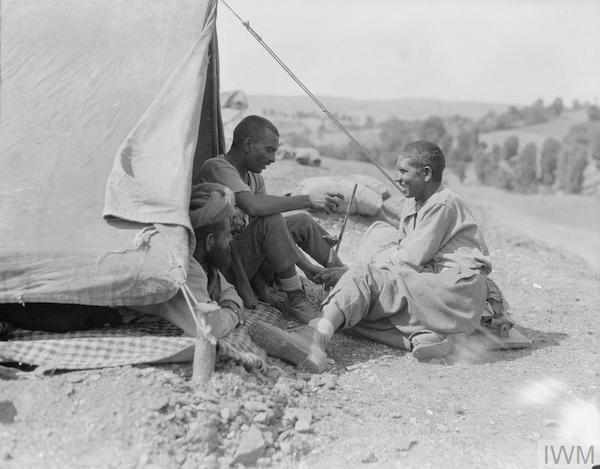 Indian troops smoking at the entrance to their tent, Salonika, September, 1916. © IWM (Q 32322)