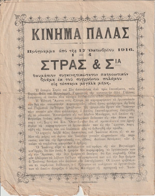 Amongst the souvenirs of the campaign collected by Private Herbert Price of the ASC Supply Department is a rather fragile flyer for Salonika’s Palace Cinema for the week beginning Monday 30 October 1916. Two films were on offer, the first a French silent film from the previous year, Strass & Compagnie, described as ‘a grand patriotic and poignant drama … in four long parts’, which doesn’t seem a great choice for men seeking escapism from war. In which case, maybe Herbert’s preference was for the 1912 American short, A Millionaire for A Day. Described by one US paper as ‘a screaming comedy’, this 1912 American silent short – based on a true story – is about a mechanic who goes to New York City and squanders his inheritance in a single day, returning home broke but wiser (Wikipedia). On the coming Friday, the film Pont du Diable (Devil’s Bridge) was promised, although this sounds uncomfortably like a location in the Struma valley!