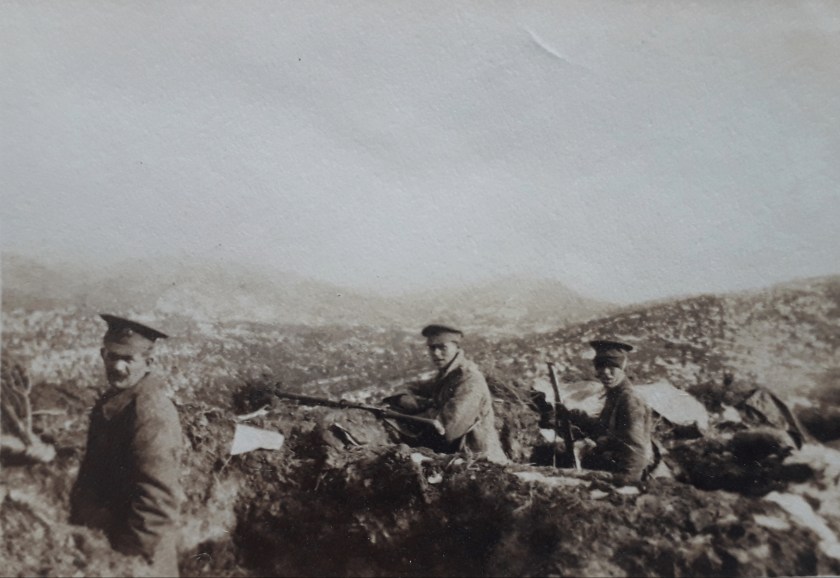 Irish fusiliers – possibly Munsters – in a shallow trench or sangar during the winter fighting in 1915 around Kosturino. The photograph is believed to have been taken by 2nd Lt David Cowan of 5/Connaught Rangers. With thanks to Graeme Sheppard and David Cowan’s grandson for sharing this photo with the Society.