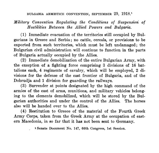Unable to stop the Allied advance, and with their army disintegrating, the Bulgarian government called for an armistice. This was signed on the 29th of September and came into force at noon the following day. However, these dramatic events in the Balkans were quickly forgotten with the coming of the signing of the armistice with Germany on the 11th of November 1918, which brought the First World War to a close.