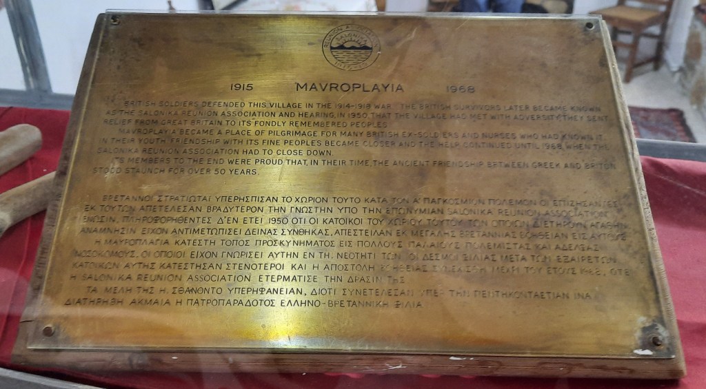 A highlight of the SCS Battlefield Tour of 2023 was a visit to the village of Mavroplayia. The village, named Karamudli back in the BSF’s day, was adopted by veterans of the Salonika Reunion Association between 1951 and 1968 under the Greek Red Cross Village Adoption Scheme. This is commemorated by a plaque now housed in the village heritage centre.