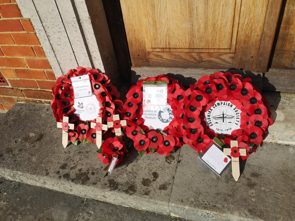 For the second year a memorial service was held at Sandham Memorial Chapel. A gathering of approximately 40 people took part in the act of Remembrance. This was led by Reverend Mark Christian himself a veteran army chaplain. The exhortation was read by David Innes. Wreaths were laid at the entrance to the chapel by the National Trust, Salonika Campaign Society and Soldiers of Oxfordshire Museum. Individuals laid Poppy Crosses too. The ladies of the WI produced a net covered with poppies in different styles. This will be placed on the altar of the parish church. After the service, tea, coffee and cake were served by the volunteers of the Chapel. The exhibition was made available as well as viewings of Stanley Spencer’s paintings inside of the Chapel walls. Some SCS members then retired to The Carpenters Arms for lunch. Next year a larger gathering is being planned at the Chapel by the National Trust.